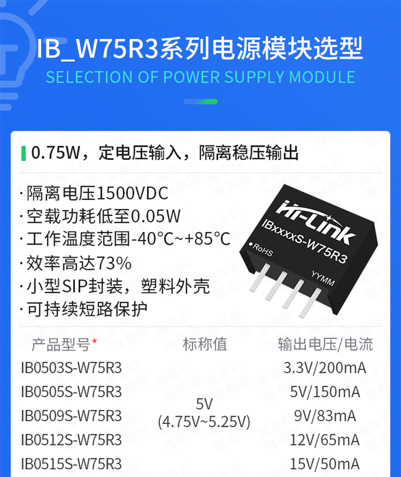 IB S-W75R3系列一是专为客户设计的小体积、高效率的微小功率,定电压输入隔离稳压单路输出,DC/DC模块电源。该系列产品是专门针对板上电源系统中需要产生一组与输入 电源隔离的电压的应用场合而设计的。该产品适用于: