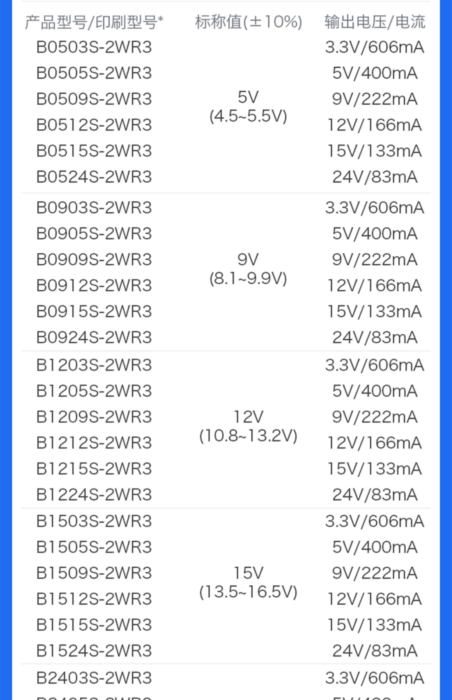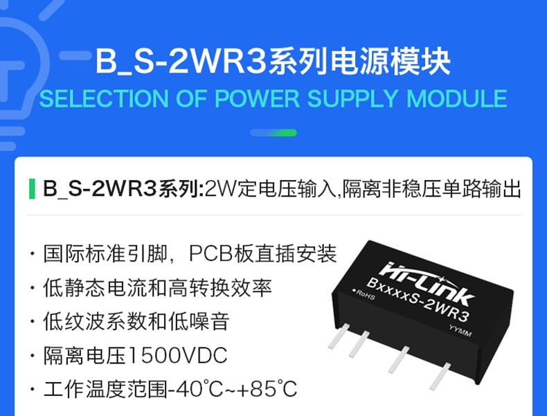 B S-2WR3系列--是海凌科为客户提供小体积,高效率的微小功率,定电压输入,隔离非稳压单路输出,DC/DC模块电源;该系列产品是专门针对板上电源系统中需要产生一组与输入电源隔离的电压的应用场合而设计的。该产品适用于:输入电源的电压比较稳定(电压变化范围土10%Vin);
