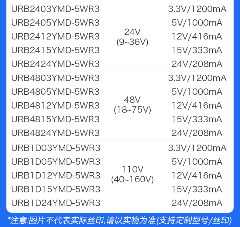 UR(A)B_YMD-5WR3 系列产品输出功率为 5W,4:1宽电压输入范围,效率高达 90%,1500VDC的常规隔离电压,允许工作温度-40℃to +85℃,具有输出过压、过流、短路保护功能,裸机满足 CISPR32/EN55032CLASSA,广泛应用于医疗、工控、电力、仪器仪表、通信、铁路等领域。