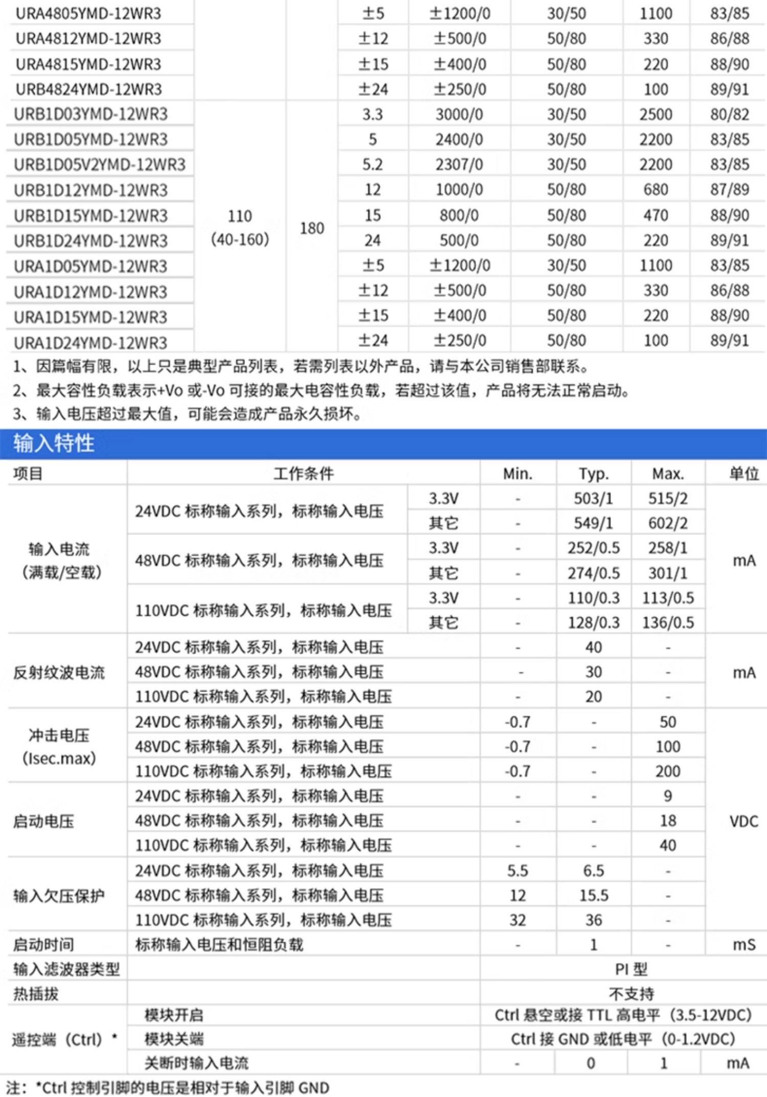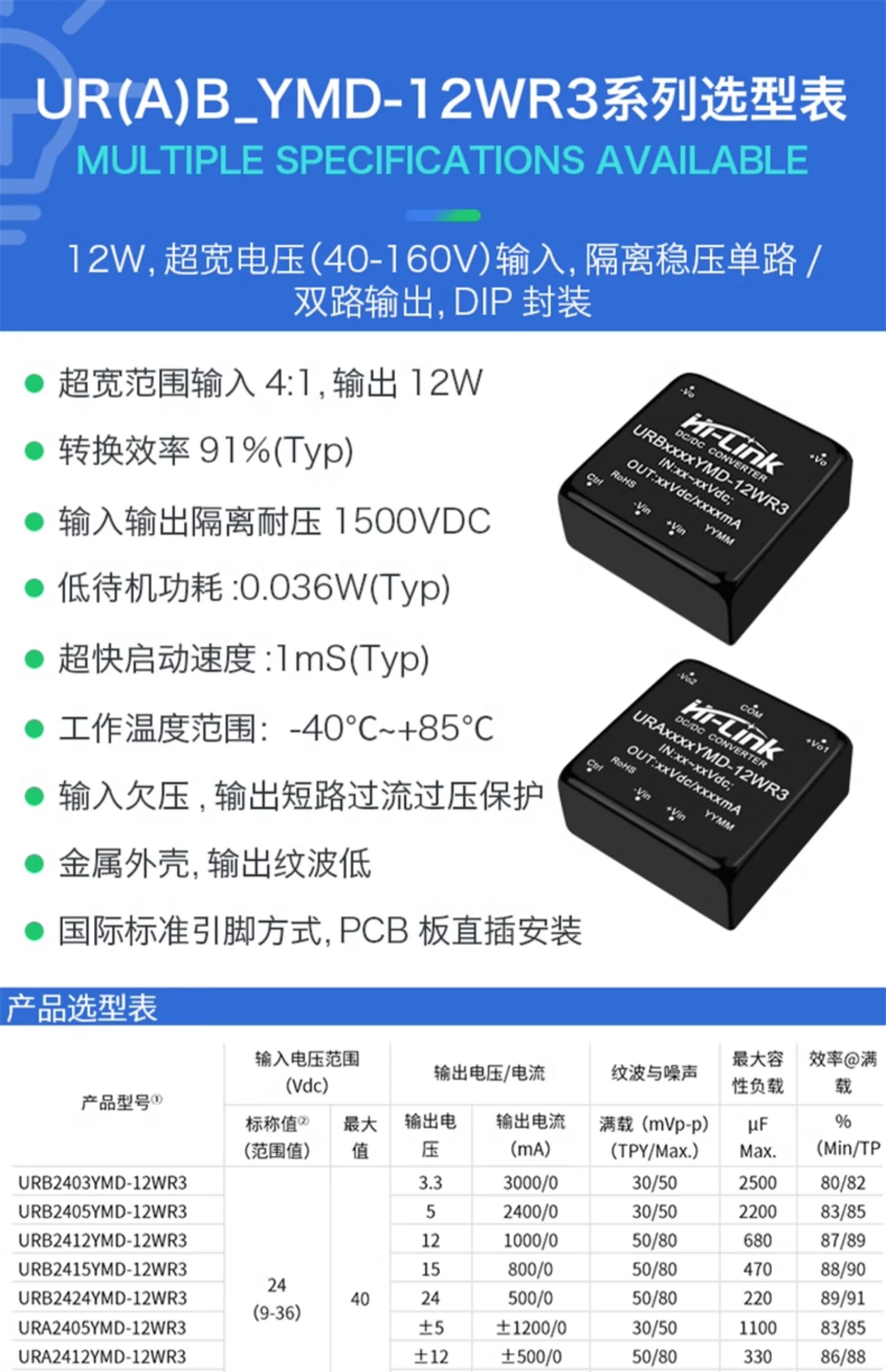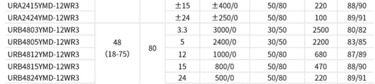 UR(A)B YMD-12WR3 系列产品输出功率为 12W,4:1 宽电压输入范围,效率高达 91%,1500VDC的常规隔离电压,允许工作温度-40Cto+85℃,具有输入欠压保护,输出过压、过流、短路保护功能,裸机满足CISPR32/EN55032CLASSA,广泛应用于医疗、工控、电力、仪器仪表、通信、铁路等领域。