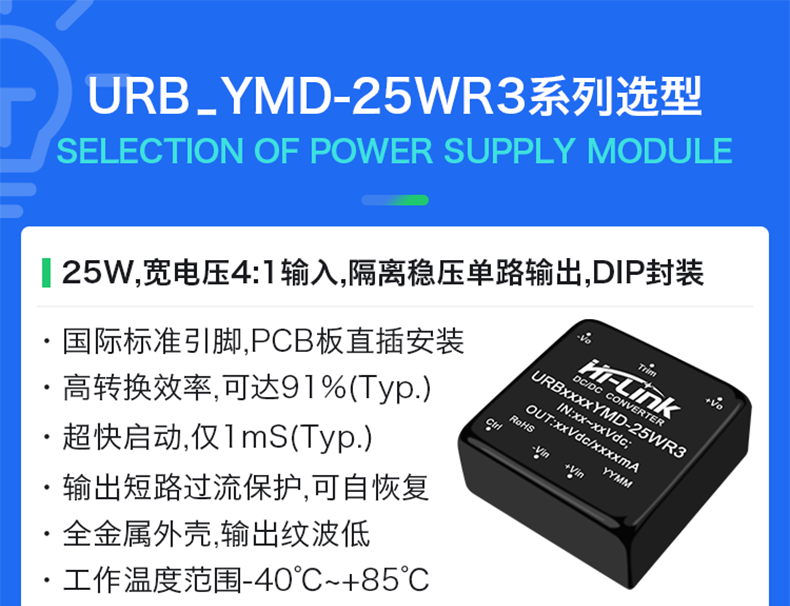 URB_YMD-25WR3& URA_YMD-25WR3系列产品输出功率为25W,4:1 宽电压输入范围,效率高达 91%,1500VDC的常规隔离电压,允许工作温度-40°C to+85℃,具有输入欠压保护,输出过压、过流、短路保护功能,裸机满足 CISPR32/EN55032 CLASSA,广泛应用于医疗、工控、电力、仪器仪表、通信、铁路等领域。