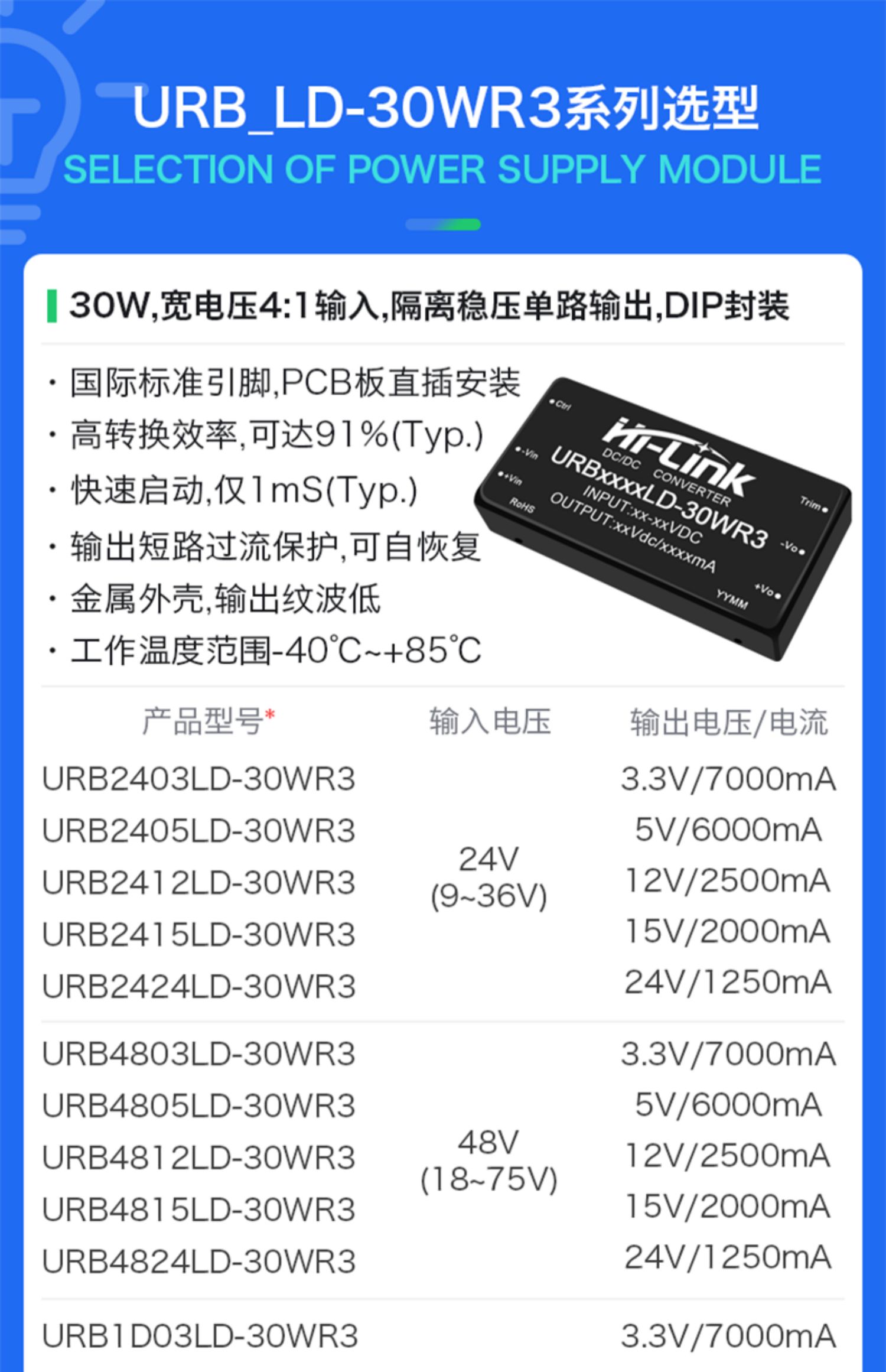UR(A)B_LD-30WR3 系列产品输出功率为 30W,4:1宽电压输入范围,效率高达 91%,1500VDC的常规隔离电压,允许工作温度-40°Cto+85°℃,具有输入欠压保护,输出过压、过流、短路保护功能,裸机满足CISPR32/EN55032CLASSA,广泛应用于医疗、工控、电力、仪器仪表、通信、铁路等领域。