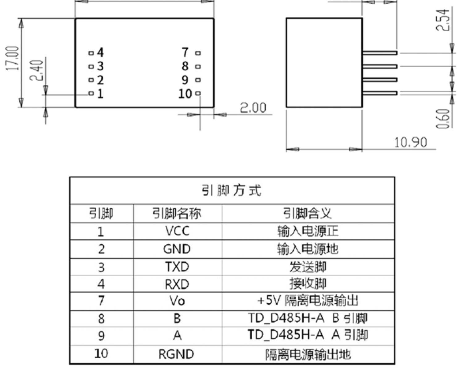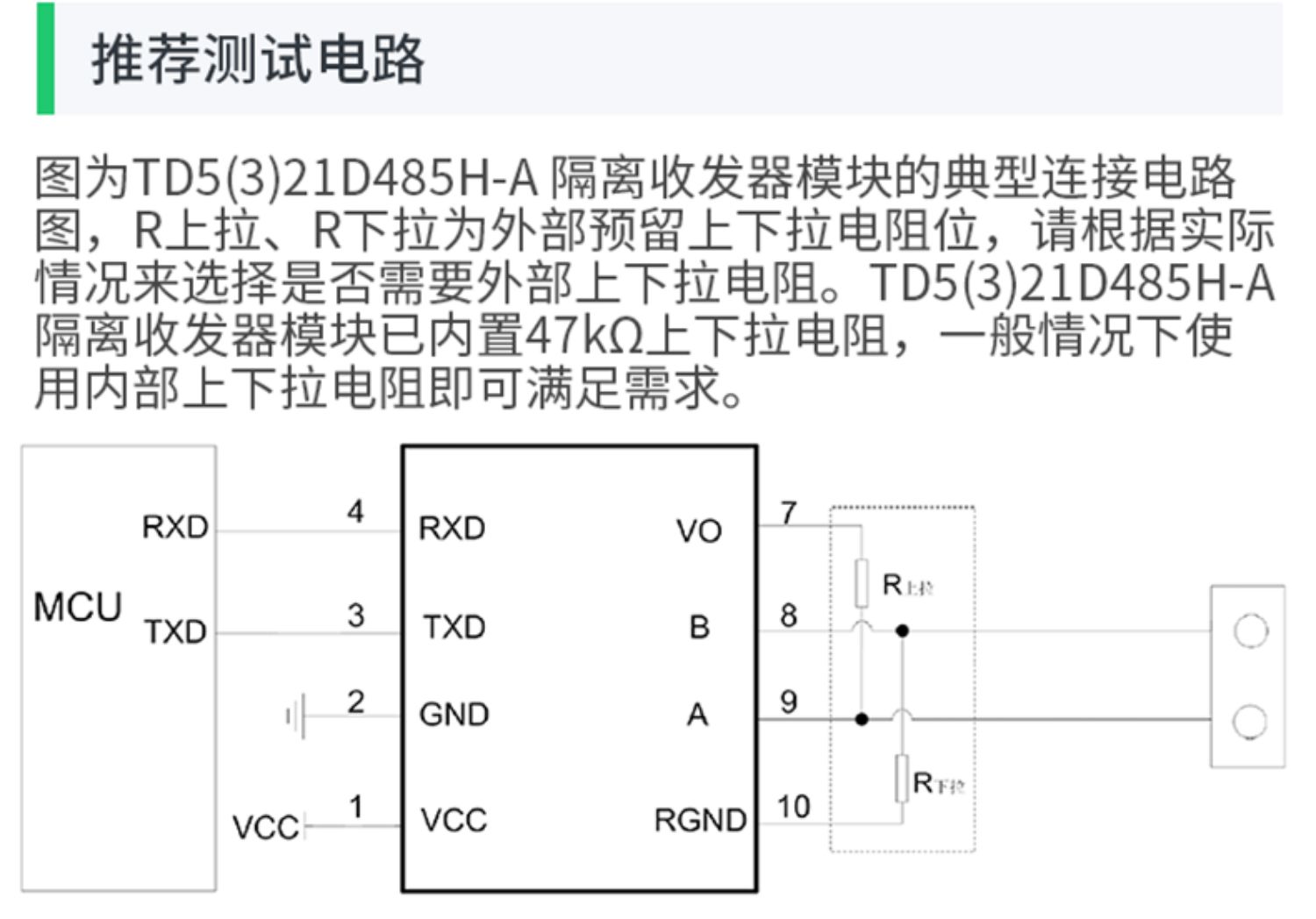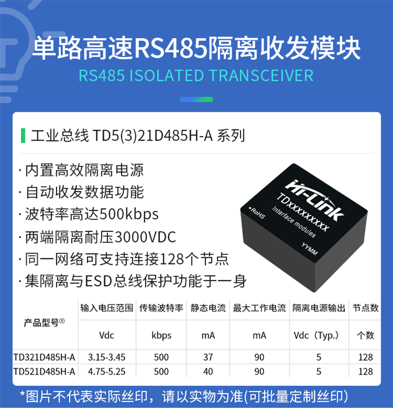 D321D485H-A/TD521D485H-A,主要功能在于将逻辑电平转换为RS485协议的差分电平,实现信号隔离,是-款采用IC集成化技术,实现了电源隔离、信号隔离、RS485通信和总线保护于一体的RS485协议收发模块。产品内置定压隔离电源,可实现3000VDC电气隔离。此外,产品具有自动切换收发功能,不再需要通过CON脚进行收发控制,在一定程度上减少了设计的复杂性。