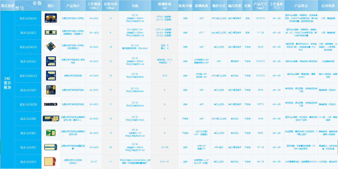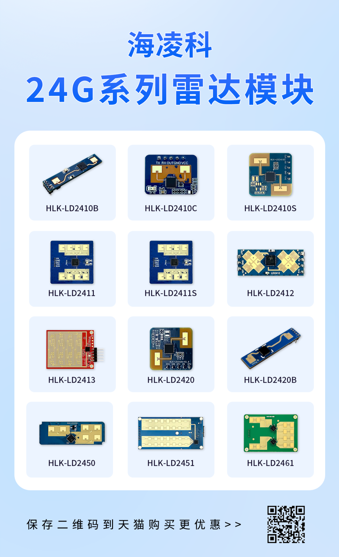 海凌科人体存在检测应用方向的模块包含HLK-LD2412、HLK-LD2410B、HLK-LD2410C、HLK-LD2410S四款产品。