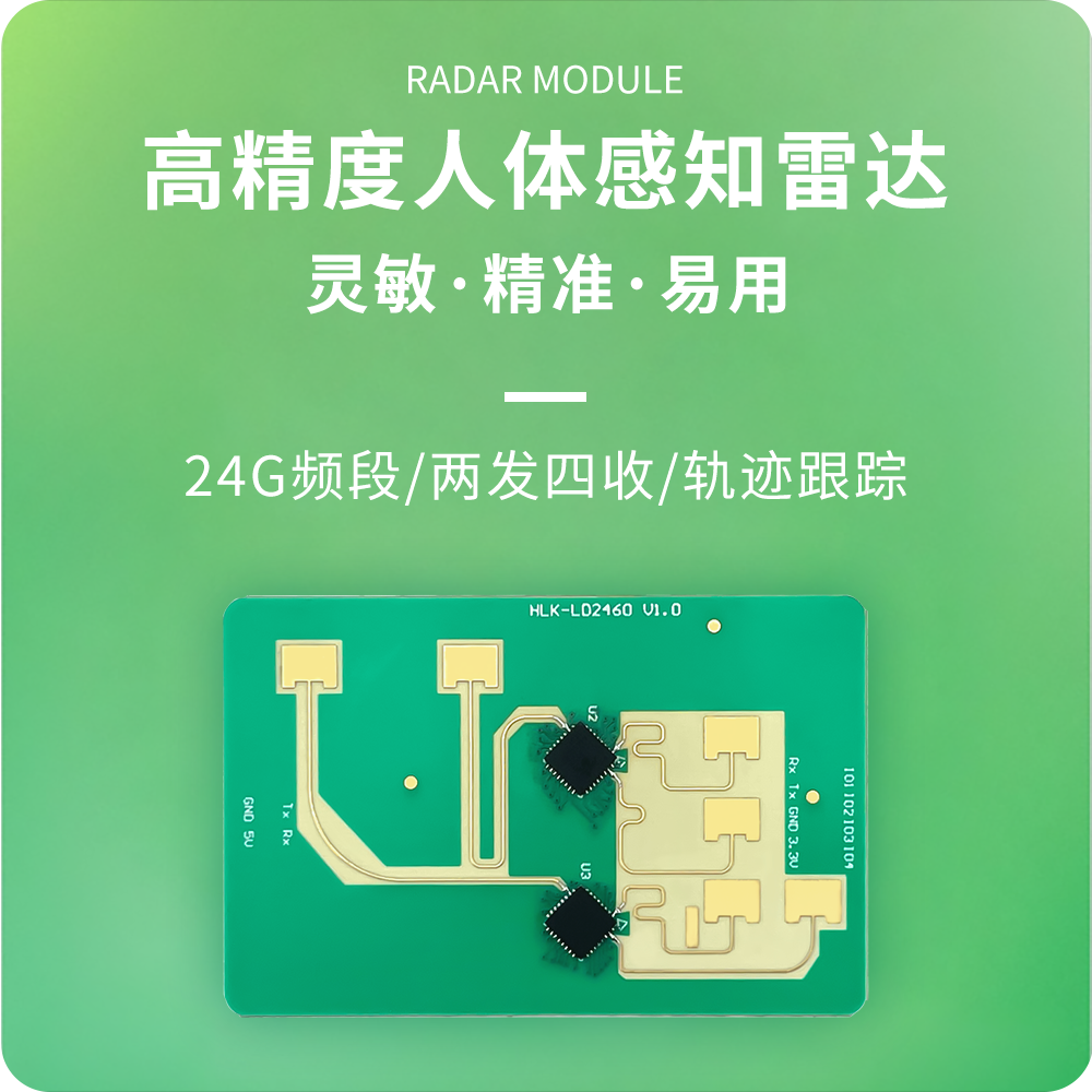HLK-LD2460是一款用于多目标轨迹、区域跟踪的高精度24GHz毫米波雷达模块。传感器硬件由毫米波雷达芯片、高性能2发4收微带天线、MCU及外围辅助电路组成。