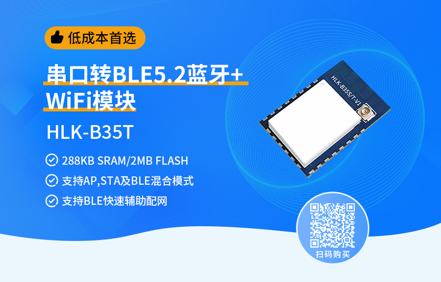 低成本项目首选WiFi模块,BLE5.2蓝牙+WiFi二合一新品HLK-B35T,功耗低至200uA,低功耗低成本高性能,超绝性价比,扫码下图二维码有机会可免费领取样品!