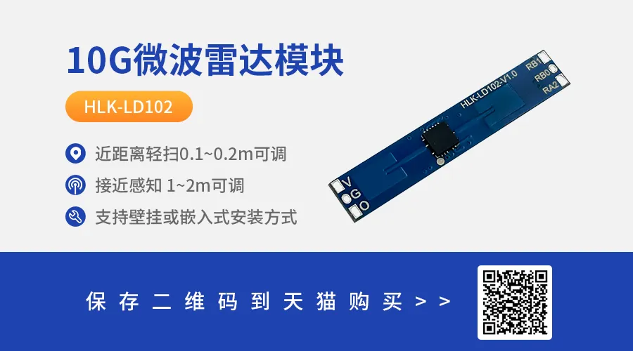 10G微波雷达模块HLK-LD102,支持手扫感应和接近感应两种感应方式,近距离轻扫0.1~0.2m可调,接近感知 1~2m可调,仅需5.5元就可以让普通灯具升级为智能灯控,超高性价比。